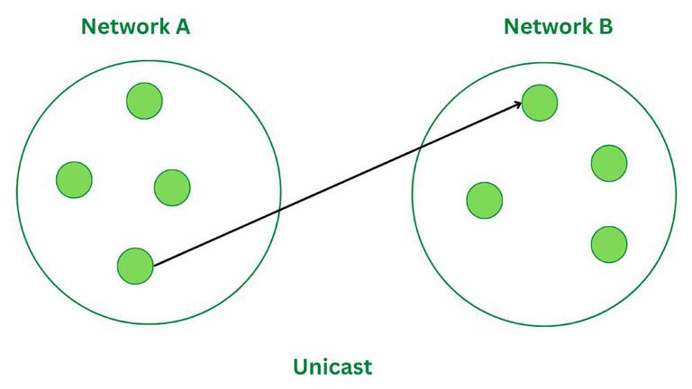 单播传输是一种数据传输方式,即数据从一个节点(单个发送节点)传输到另一个节点(单个接收节点)。单播传输属于一对一的通信方式。发送节点位于一个网络中,而接收节点则位于另一个网络中。让我们通过一个例子来理解单播的概念。