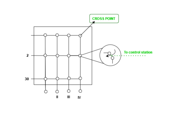 - 交叉线交换机用于连接各路线路。 n输入到m输出结果时,可以使用电子微开关或晶体管来作为各个交叉点的控制装置,如图5所示。