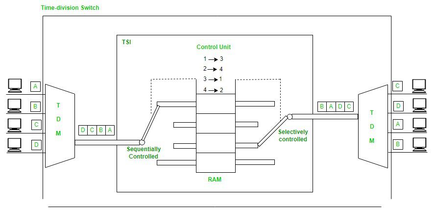 图7:时隙的交换- 这个形象融合了多种元素/特征。TDM多路复用器一个TDM多路分离器,以及一个由……组成的TSI。随机存取存储器(RAM)具有多种存储位置。