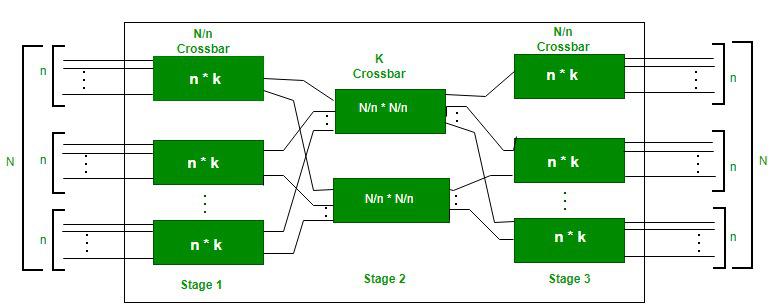 - 在中间阶段,每个交叉点都可以被第一或第三阶段中的多个交叉点所访问。