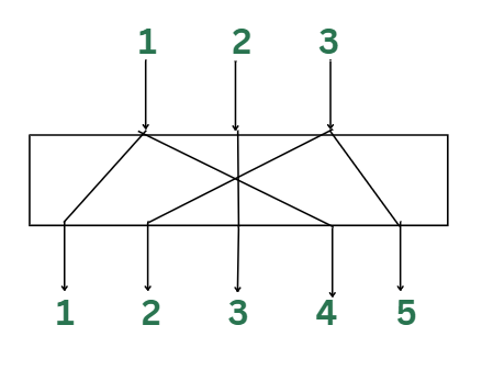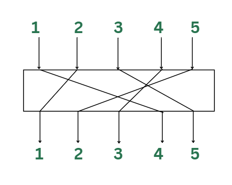 A p-box“排列盒”用于对输入字符中的各个字符进行重新排列。简单来说,它就是对各种位进行重新排序的过程。在这里,1、2、3、4、5分别表示各个位的序号,而位于这些序号位置上的各位则通过预定义的p-box来进行重新排列。