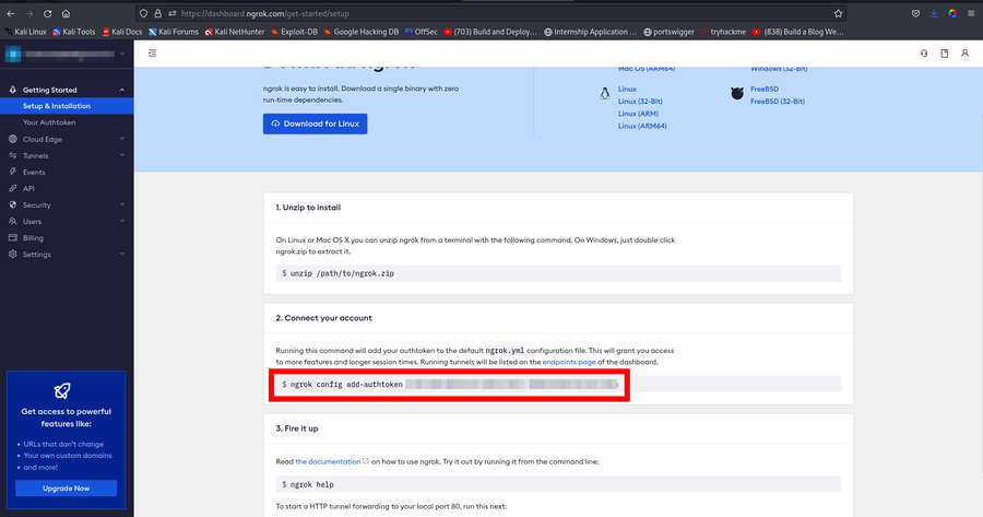 Ngrok可执行文件现在,我们需要提供一个认证密钥来运行 ngrok 服务。该密钥存储在已下载的仪表板中。您可以登录 ngrok 的官方网站,或者如果您是新创建的账户,也可以直接创建一个新的账户。
