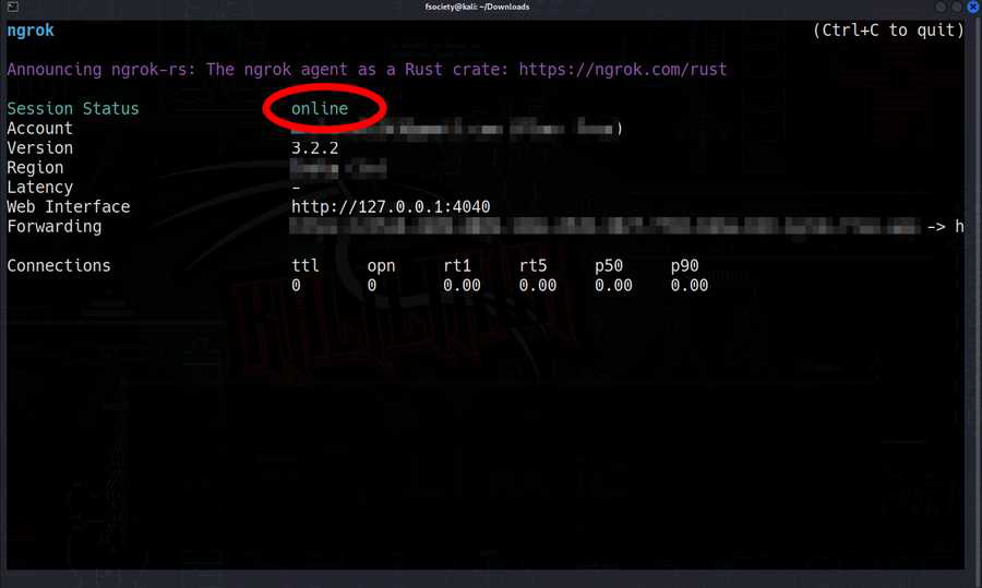 在 Auth-Token中添加相关信息,以便将 NGROK 与账户进行连接。现在,让我们检查一下,是否已经正确地设置了 ngrok 服务吧。