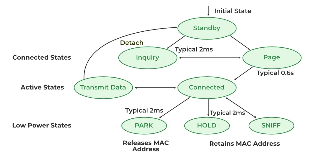 任何蓝牙设备的状态大致可以分为两种:待机状态和连接状态。处于待机状态的设备不会参与任何网络中的通信。而处于连接状态的蓝牙设备则会与某个小型网络进行同步。这样的设备可以处于以下四种模式之一: