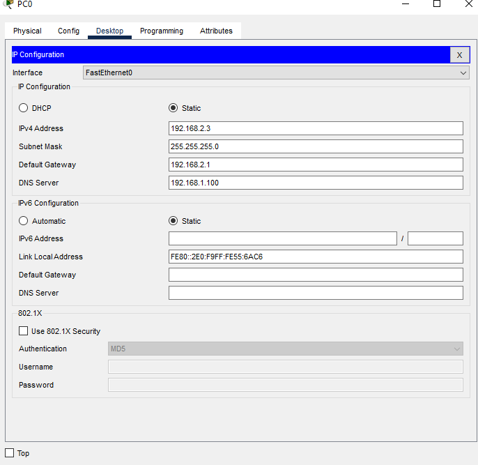 | PC0 | 192.168.2.3 | 255.255.255.0 | 192.168.2.1 | 192.168.1.100 |