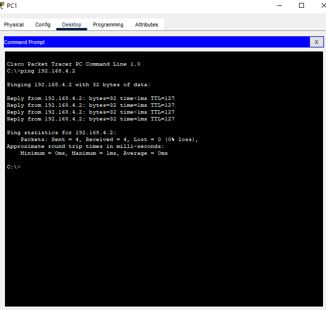 | PC4 | 192.168.4.3 | 255.255.255.0 | 192.168.4.1 | 192.168.1.100 |