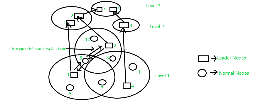 - 网关节点这些节点属于两个或更多的集群。在图中,那些被两个或更多集群共享的节点,就是网关节点。例如,节点6和7就属于这种情况。