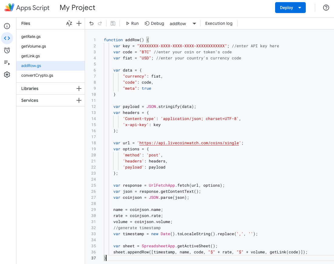 那个addRow()然后,该函数会在当前活动的电子表格中添加一个新行,其中包含了当前的时间戳、加密货币的名称、代码、汇率、交易量,以及链接到Live Coin Watch网站上的该加密货币相关信息的URL。这个URL是通过调用我们的相关函数来获取的。getLink()该函数以加密货币代码作为输入参数来运行。