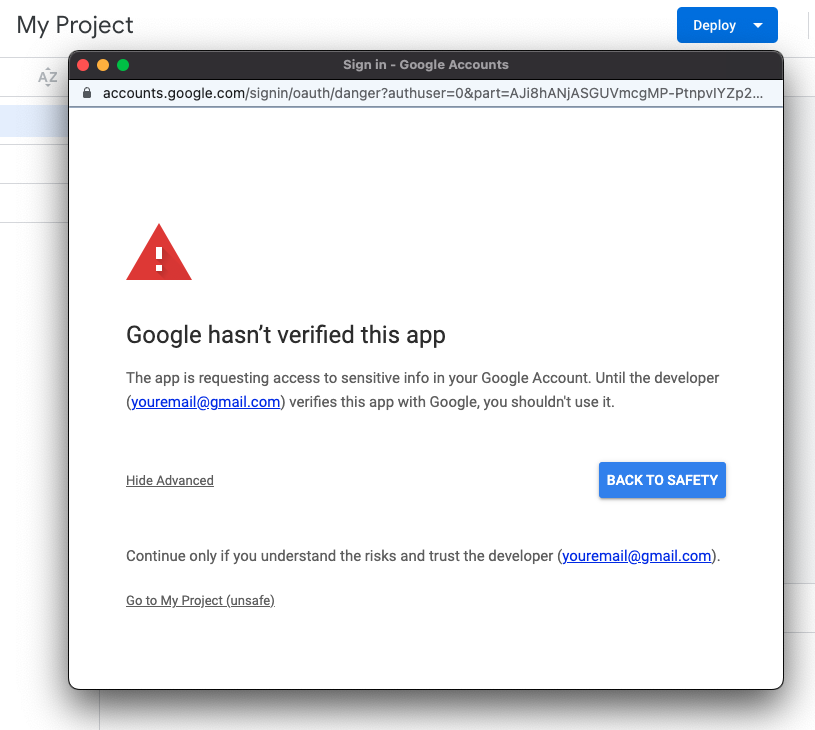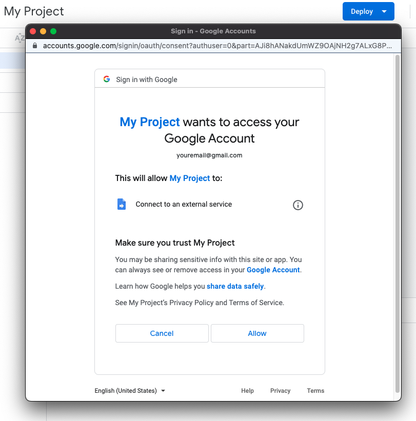 步骤6:保存你的项目,然后点击确定。跑吧。当系统提示您接受所需的权限时,请选择相应的选项。审核权限 > 请前往“我的项目”页面(该页面处于不安全状态)。 > 允许。这个授权流程将使您的项目能够与外部服务进行交互(例如 Live Coin Watch API)。