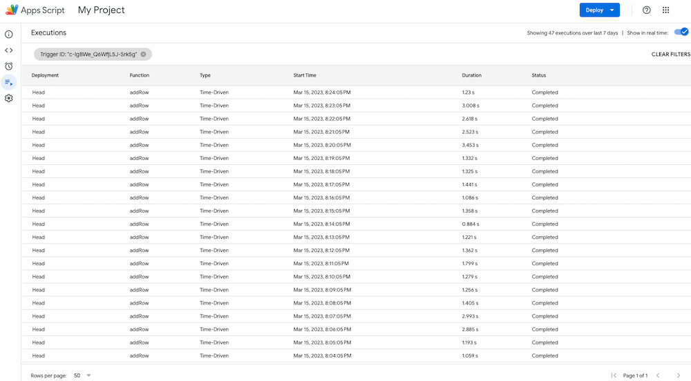 步骤12:在 Apps Script 的项目视图中,导航到“Triggers”视图(时钟图标),然后点击该按钮。+ 添加触发条件点击按钮。选择相应的功能。addRow()请选择事件来源。时间驱动请选择基于时间的触发方式:计时器请选择分钟间隔:每分每秒。