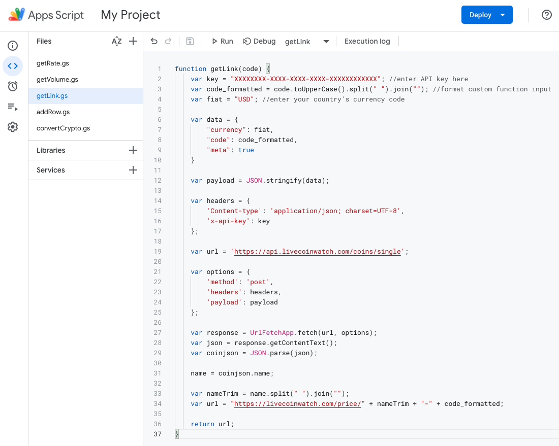 步骤10:再添加另一个脚本吧。getLink.gs通过该功能,可以将链接返回到Live Coin Watch上该货币的列表页面。getLink()