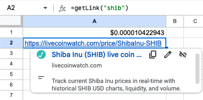 调用该函数吧。getLink("shib")请返回Live Coin Watch上关于Shiba Inu币的页面链接。