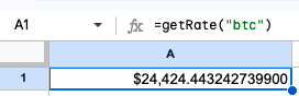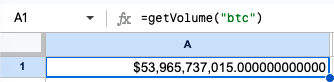 请打电话吧。getVolume()从单元格中调用自定义函数=getVolume("btc")即恢复比特币的24小时交易量。