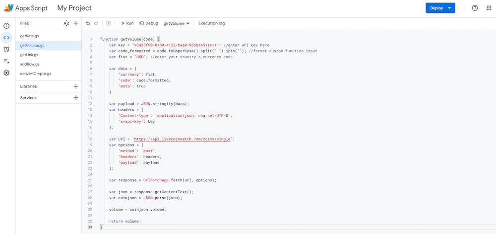 步骤9:再添加另一个脚本吧。getVolume.gs并创建一个getVolume()该函数用于返回该货币在24小时内的交易量。