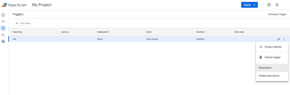 您可以通过点击“触发器”页面上“基于时间的触发器”右侧的三个点来查看每个执行的详细信息,然后选择相应的选项。处决选项。