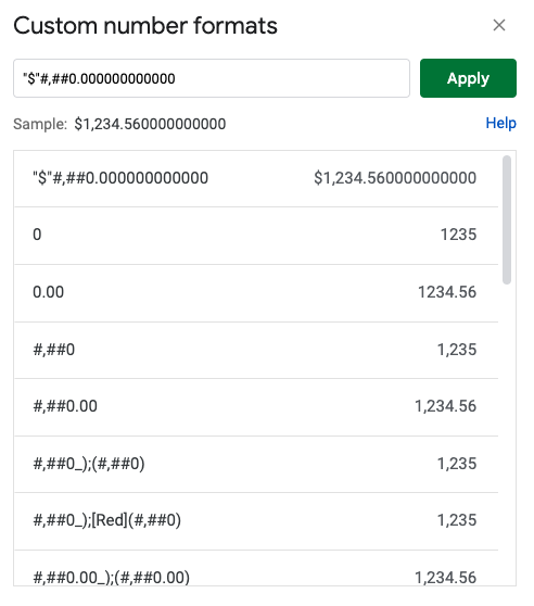 步骤7:使用菜单选项来格式化单元格或列。格式 > 自定义数字格式用于设置货币符号以及小数位的个数。