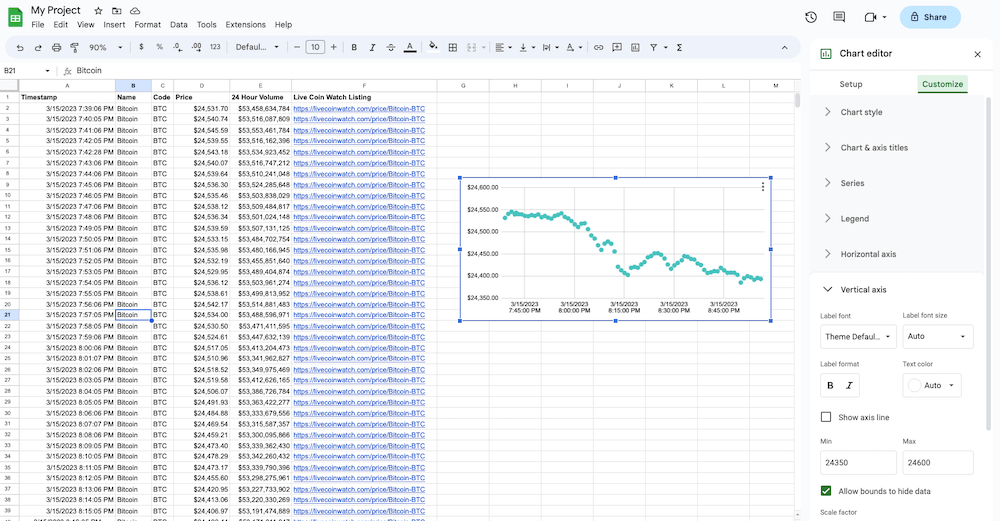 步骤13:根据个人喜好,在表格中添加一列用于标注数据列的名称。然后,从菜单选项中插入图表到该工作表中。插入 > 图表图表类型:散点图请设置一下吧。X轴和Y轴针对时间戳和速率列的范围2:1000同时,还需要进行相应的调整。垂直轴所期望的价格范围的限制。