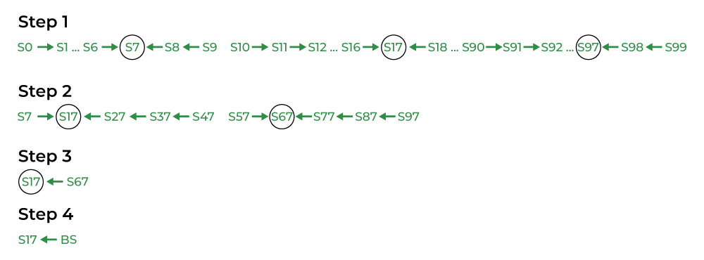 因此,在第二级中,S2将存储的数据发送给S4,而S6则把存储的数据发送给S7。在第二级结束时,S4拥有来自S1、S3以及S2的存储数据;而S7则拥有来自S5和S6的存储数据。