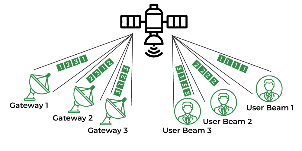 与其使用单一天线波束,不如采用其他方案。大量的窄波束天线,可以通过根据TDMA帧率来同步地切换天线的连接方式来使用这些天线。因此,需要依次覆盖整个区域。这样做有助于在整个覆盖区域内保持持续的通信连接。这种技术被称为卫星切换TDMA(SS/TDMA)。