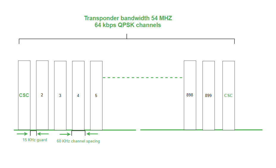 如上图所示,常见的信号传输通道位于发射机带宽的两端。 因此,当一台具有非常小的孔径的终端设备想要接入卫星时,它会以CSC频率发送一个控制数据包给卫星,然后等待卫星的回复。 随后,这些控制数据包被控制地球站接收。这些控制站会对这些数据包进行解码,从而获取该呼叫所指向的特定卫星的地址,以及发起请求的站的地址。