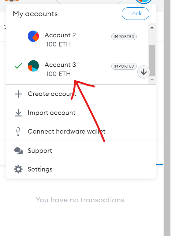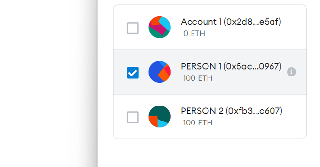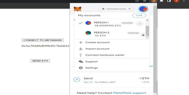 已经导入了两个账户。H.通过这种方式,我们已经在 MetaMask 中导入了来自 Ganache 的两个账户。接下来,我们将使用这两个账户来完成我们的任务。