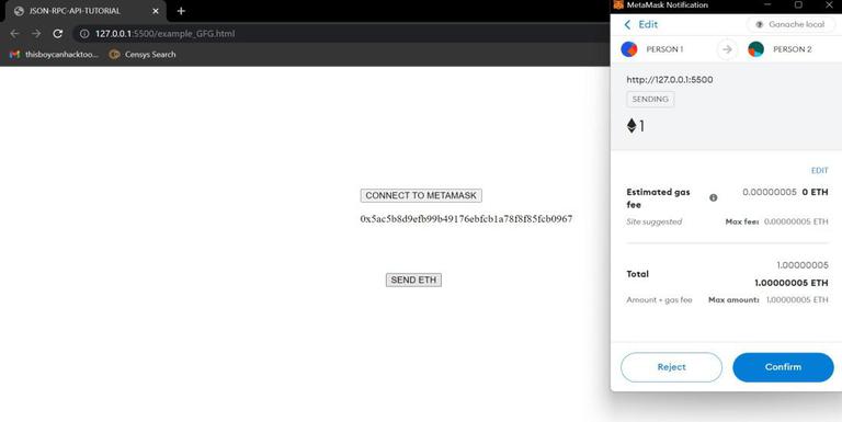 5. 点击“SEND ETH”按钮,即可发送您的ETH货币。此时,又会弹出一个与MetaMask相关的窗口,您可以在其中查看从“PERSON 1”到“PERSON 2”之间的交易详细信息。确认输入的信息是否正确后,再点击“确认”按钮即可。
