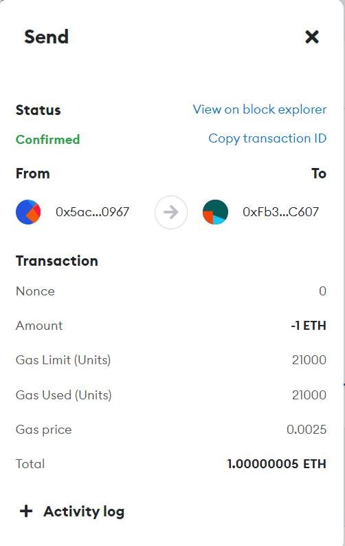 交易已确认7. 可以看出,ETH金额已经从PERSON 1的账户中扣除,然后被反映到了PERSON 2的账户中。