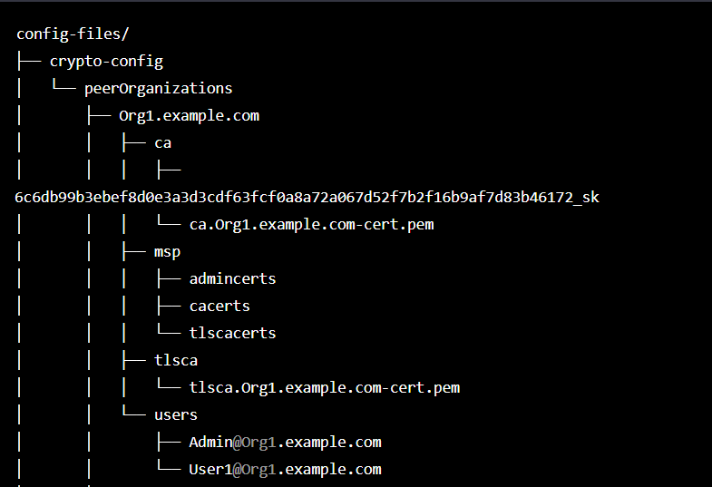 步骤4:配置生成器会生成网络所需的配置文件,包括网络配置、通道配置、加密材料配置以及其他用于设置和运行网络的必要文件。这些文件会被保存在“config-files”目录下,该目录就是你在前一步中指定的输出目录。