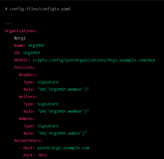- 参与者的身份信息:配置生成器以网络中参与者的身份信息作为输入。这些信息包括参与者的姓名和角色,以及他们的加密密钥和证书。