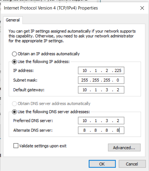 步骤8:为您的计算机分配一个固定的IP地址,例如10.1.2.225。