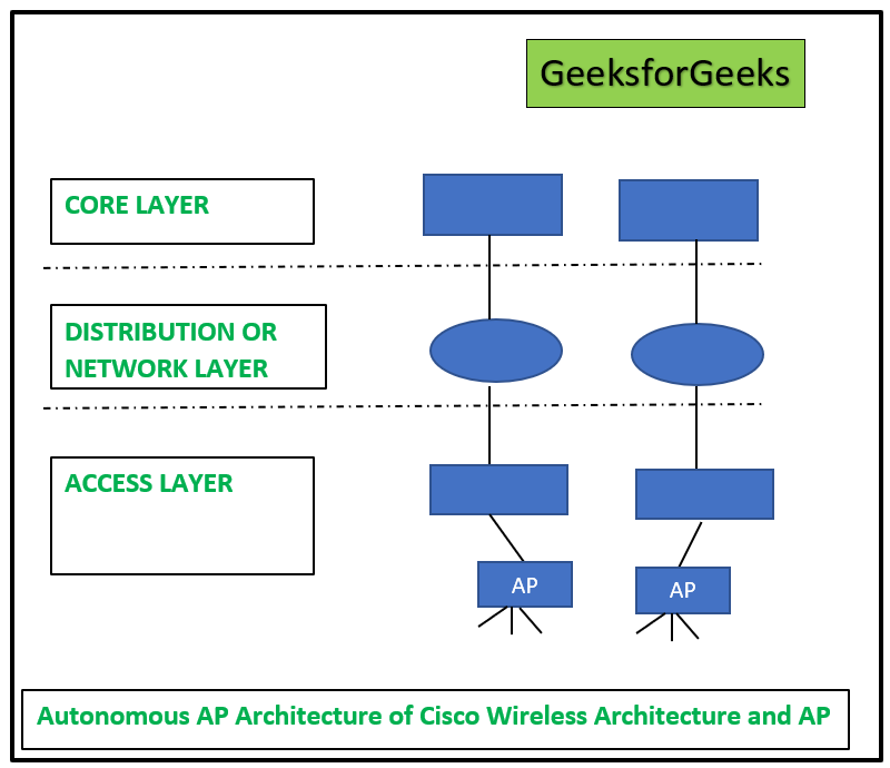 Cisco无线架构和接入点模式的主要作用,就是实现无线网络和有线网络之间的连接,从而能够传输数据。 采用自主AP架构时,可以同时连接许多无线客户端。此时,网络的功能就像局域网一样运作。 中央接入点负责控制所有的无线网络和设备。这种中央接入点的设计方式是由自治AP来承担的。 由于中央接入点具备无线和有线连接功能,因此数据可以在无线网络和有线网络之间传输。 在数据传输过程中,会进行加密和解密操作。 核心层、分布层和接入层构成了思科所采用的三层架构设计。 Cisco的三层设计被升级后,就形成了Cisco无线架构以及AP模式。 请参考下面的图表,了解思科所使用的三层分层架构的详细结构。