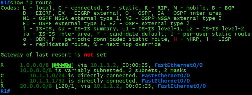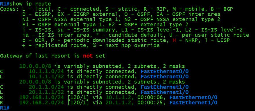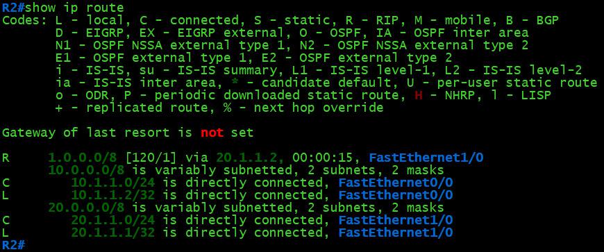 R2(config)#router rip R2(config-router)#network 10.1.1.0 R2(config-router)#network 20.1.1.0 R2(config-router)#exit