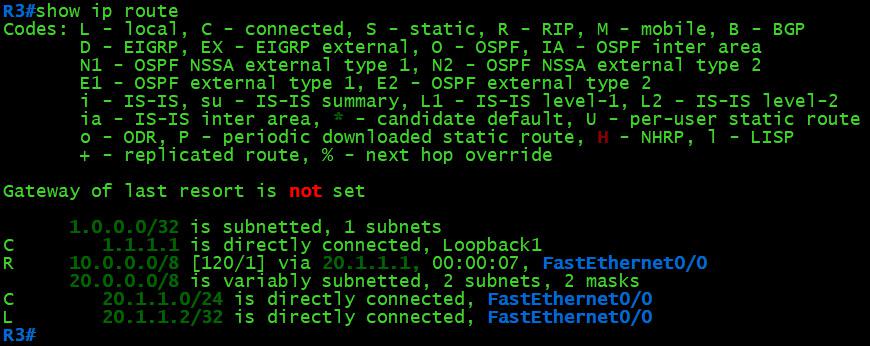 R3(config)#router rip R3(config-router)#network 20.1.1.0 R3(config-router)#network 1.1.1.1 R3(config-router)#exit