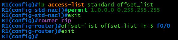 R1(config)#ip access-list standard offset_list R1(config-std-nacl)#permit 1.0.0.0 0.255.255.255 R1(config-std-nacl)#exit R1(config)#router rip R1(config-router)#offset-list offset_list in 5 f0/0 R1(config-router)#exit