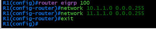 R1(config)#router eigrp 100 R1(config-router)#network 10.1.1.0 0.0.0.255 R1(config-router)#network 11.1.1.0 0.0.0.255 R1(config-router)#exit