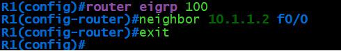 R1(config)#router eigrp 100 R1(config-router)#neighbor 10.1.1.2 f0/0 R1(config-router)#exit