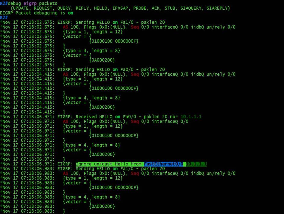 如您所见,R2同样忽略了由R1发送的单播Hello消息。