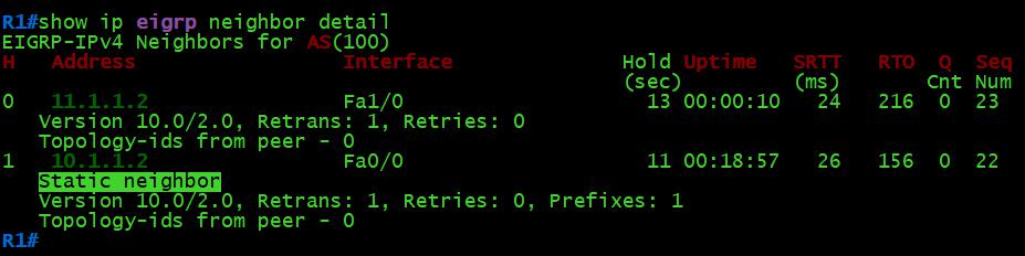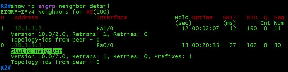R2(config)#router eigrp 100 R2(config-router)#neighbor 10.1.1.1 f0/0 R2(config-router)#exit