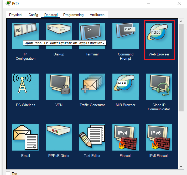 步骤6:点击PC0,进入桌面,然后打开网络浏览器。