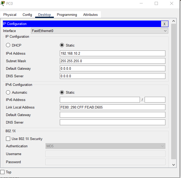 步骤1:双击操作PC0点击“桌面”按钮,然后进入“IP配置”页面。