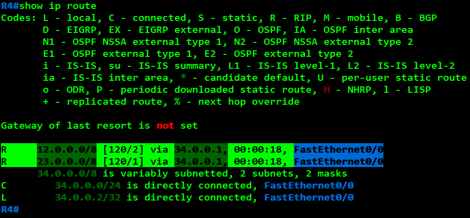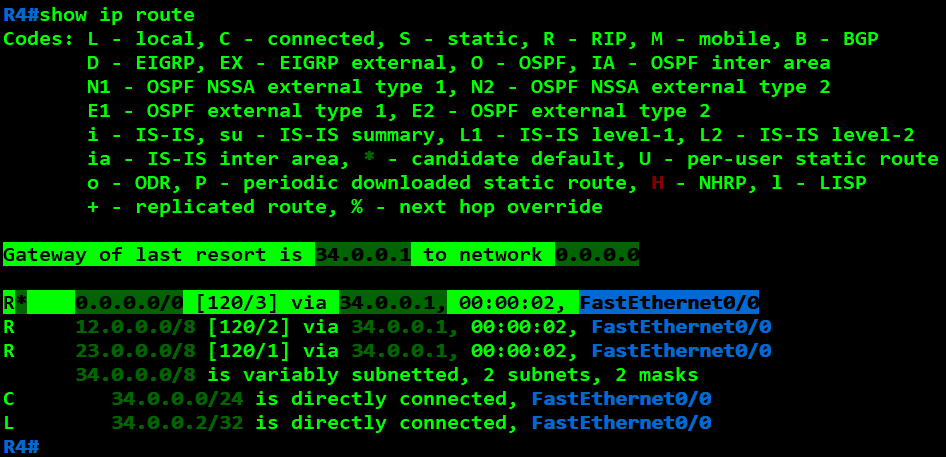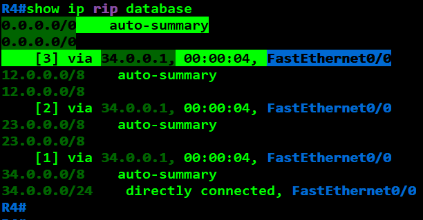 R4(config)#router rip R4(config-router)#network 34.0.0.0