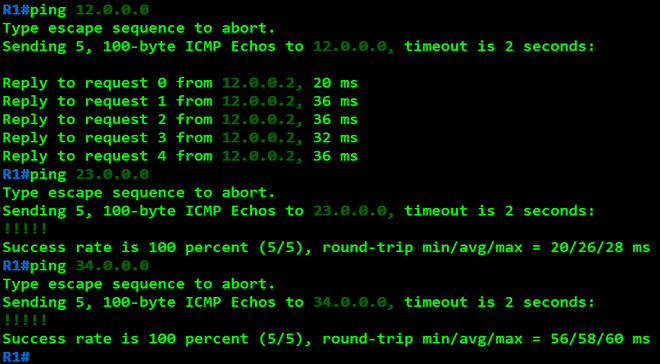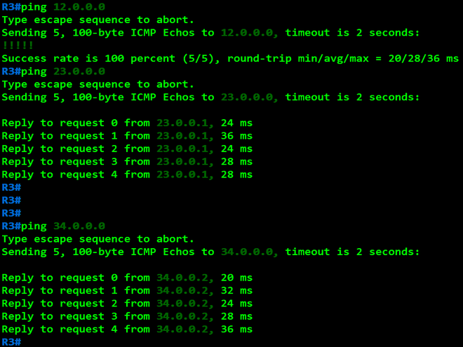 R3(config)#int f1/0 R3(config-if)#ip address 23.0.0.2 255.255.255.0 R3(config-if)#no shutdown R3(config-if)#int f0/0 R3(config-if)#ip address 34.0.0.1 255.255.255.0 R3(config-if)#no shutdown