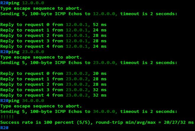R2(config)#int f0/0 R2(config-if)#ip address 12.0.0.2 255.255.255.0 R2(config-if)#no shutdown R2(config-if)#int f1/0 R2(config-if)#ip address 23.0.0.1 255.255.255.0 R2(config-if)#no shutdown