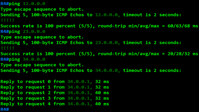 R4(config)#int f0/0 R4(config-if)#ip address 34.0.0.2 255.255.255.0 R4(config-if)#no shutdown
