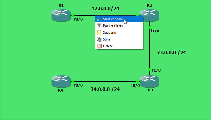 在GNS3中利用Wireshark来捕获接口信息: