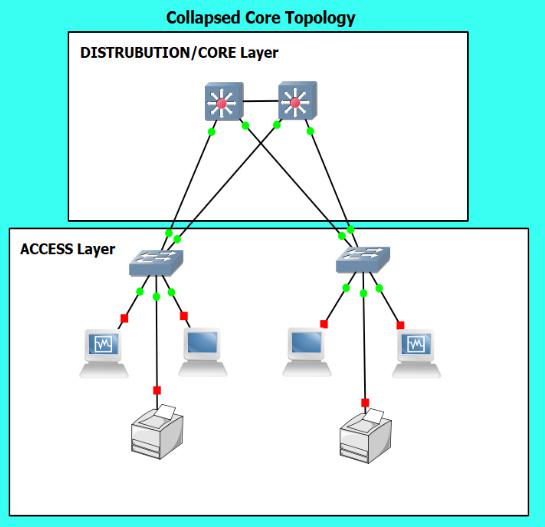 所谓“核心层崩溃”,指的是分布式层和核心层的功能是由单个设备来完成的。 这种网络设计方式被小型企业所采用,因为它们的网络规模较小,无法承担高额的网络设备成本。因此,这些企业通常会选择这种网络设计方式。 因此,这些企业采用“折叠式核心拓扑网络设计”(两层级网络结构)来降低网络成本,同时仍能保持三层级网络所提供的几乎所有优势、功能和服务。