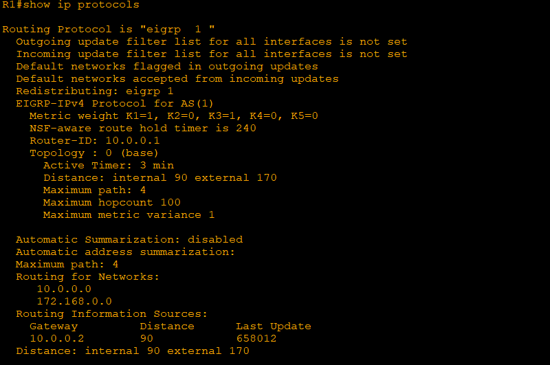 Router(config)#router eigrp 1 Router(config-router)#network 10.0.0.0 Router(config-router)#network 172.168.1.0 Router(config-router)#network 172.168.2.0