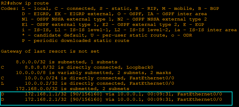 步骤8:配置R1,使其始终为172.168.1.0/32和172.168.2.0/32子网生成并传播汇总路由,这些路由会在整个EIGRP自治系统中被使用。