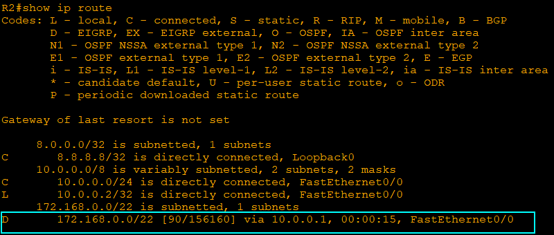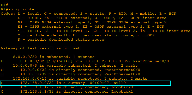 R1(config)#int fastEthernet 0/0 R1(config-if)#ip summary-address eigrp 1 172.168.0.0 255.255.252.0