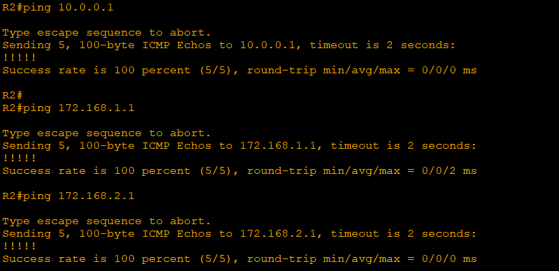 R2#ping 10.0.0.1 R2#ping 172.168.1.1 R2#ping 172.168.2.1